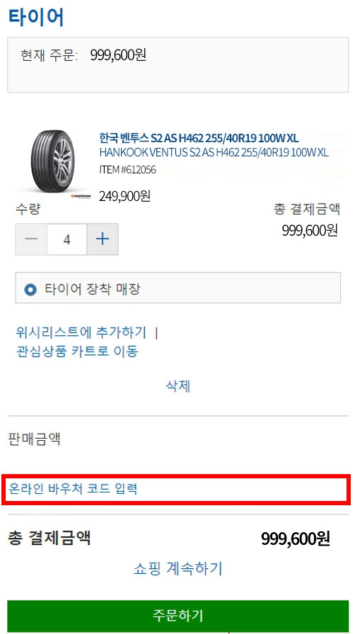 코스트코 회원이 코스트코 온라인몰에서 동일 타이어 4개 결제 시